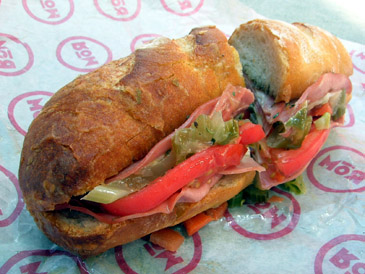 RōM, 71 S. Wacker Drive TASTE: ![]() ![]() ![]() ![]() PRESENTATION: ![]() ![]() ![]() ![]() AMBIENCE: ![]() ![]() ![]() ![]() Independently owned and with just four stores, RōM's Italian sandwich is the new kid on the block and whoa, what an attitude. How else to explain the slices of capicolla, Genoa, mortadella, provolone and tomato bathed in a wicked giardinara garnish? Forget the lettuce on this bruiser. Each bite into the crunchy baguette is like a delicious punch in the mouth. |