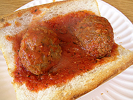 I prefer a pair of meatballs -- which makes the sandwich easy to cut in half -- served on an open, crunchy baguette, without cheese or other extras save for a marinara sauce and sprinkle of Parmesan. Obscuring their flavor with condiments, and their form with bread, just spoils the meatball magic. On with the show.